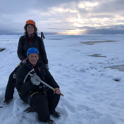 Today's adventure began early in the morning and continued until sunset. It was necessary to leave our apartment at 6am because of many hours of driving to our destination. We wanted to arrive at Skaftafell National Park an hour before our glacier hike began but arrived only about 15 minutes before the scheduled departure. Darkness, fog, snow, and icy roads really slowed us down. Five of those scheduled didn't show, making our group very small.